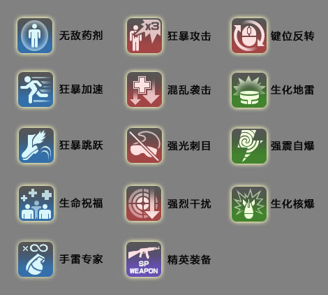 狂暴攻击:20秒内使用者所有武器的攻击力×3 (特殊道具及手雷除外)